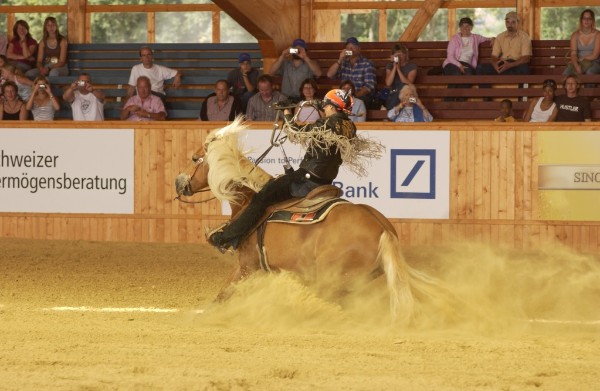 An der Freestyle Reining ist man ein bisschen großzügiger (NRHA-Regeln). Doch der Tierschutz steht auch hier an erster Stelle. Der größte Unterschied ist, dass im Bit sowohl ein-wie auch zweihändig geritten werden darf. Auch ein Wechsel dazwischen ist möglich. Man kann aber auch ohne Zaumzeug reiten oder nur mit einem Neck Rope. Das sieht natürlich besonders spektakulär aus, aber nur dann, wenn das Pferd auch willig alle Manöver ausführt.